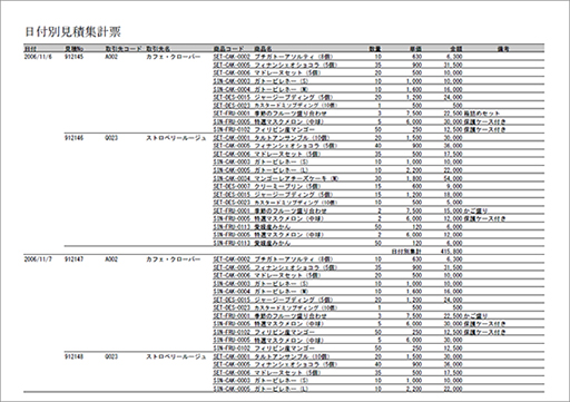 レコードを集計して小計や総計を出力する帳票です。指定したカラムの値が切り替ったタイミング、つまり、キーブレイクが発生したときに罫線の表示や集計行を表示します。例えば、「取引先別計」「日別計」といった複数段階に分かれたデータの集計も可能です。